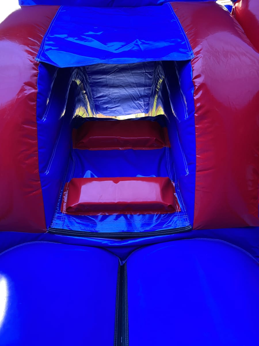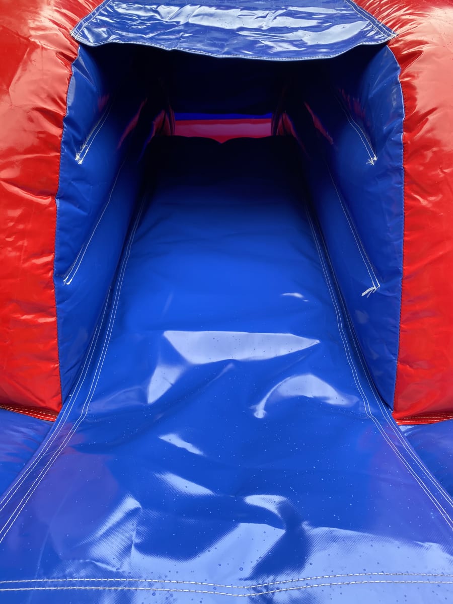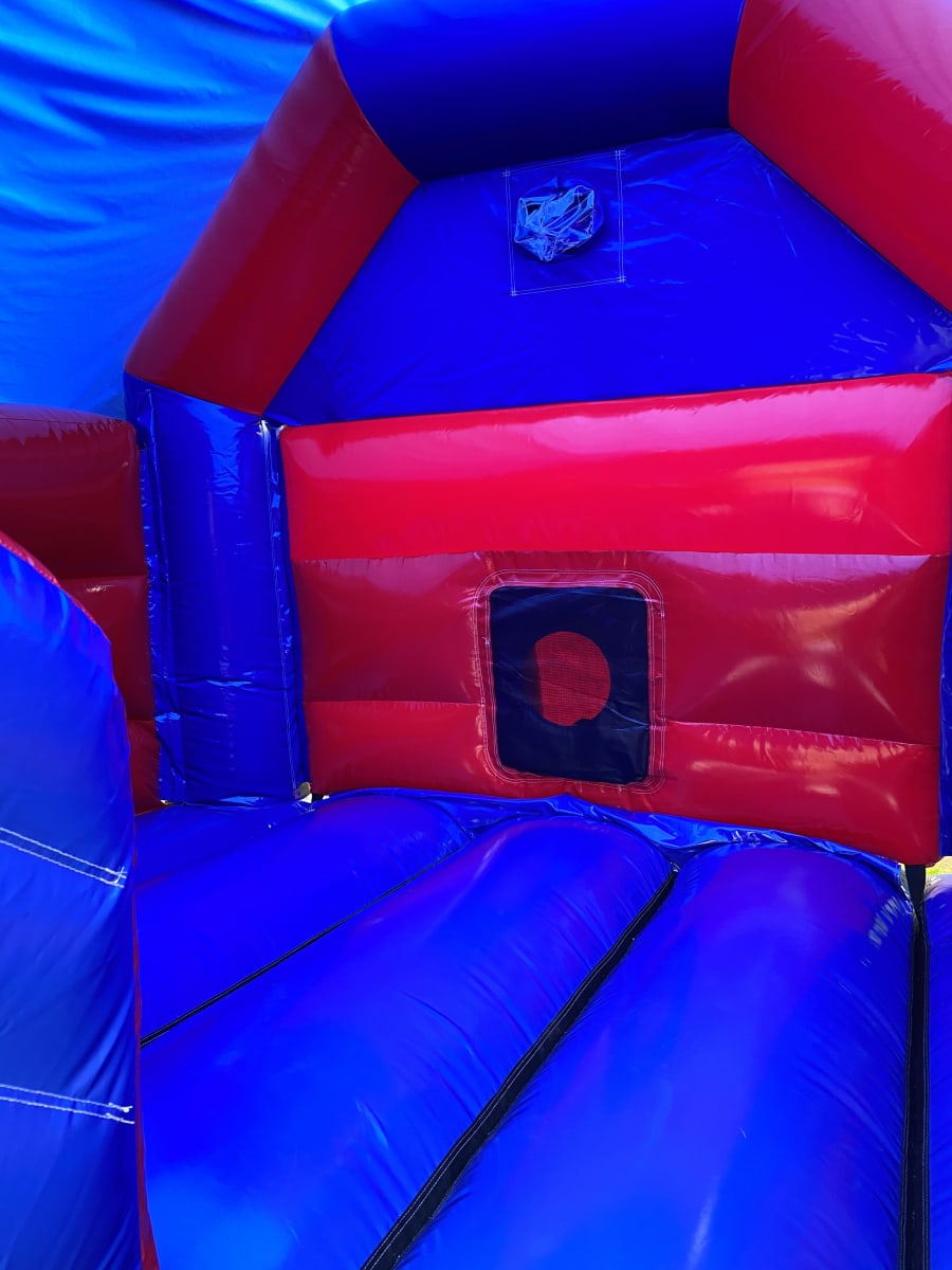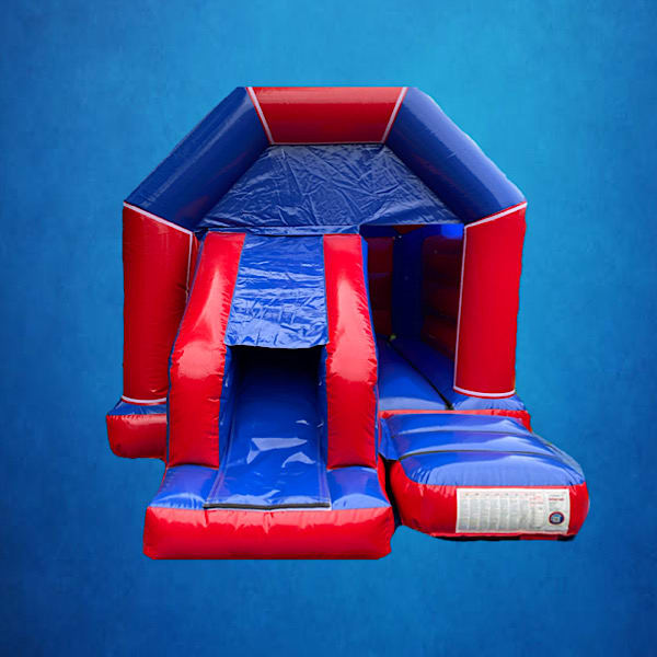 Blue and red bouncy castle and slide combi available in different themes